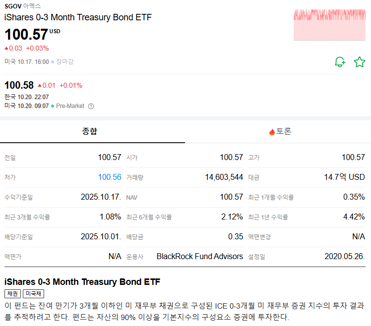 SGOV는 현재 기준으로 4.27%정도 배당수익률이 나오네요.