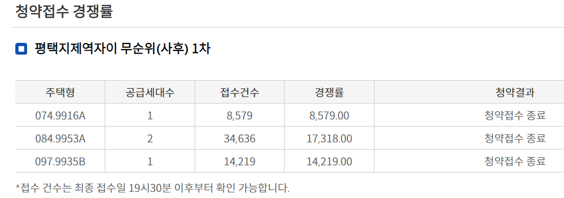 74타입은 8,579 대 1 입니다. 소형 타입이라서 적게 신청이 되었네요.