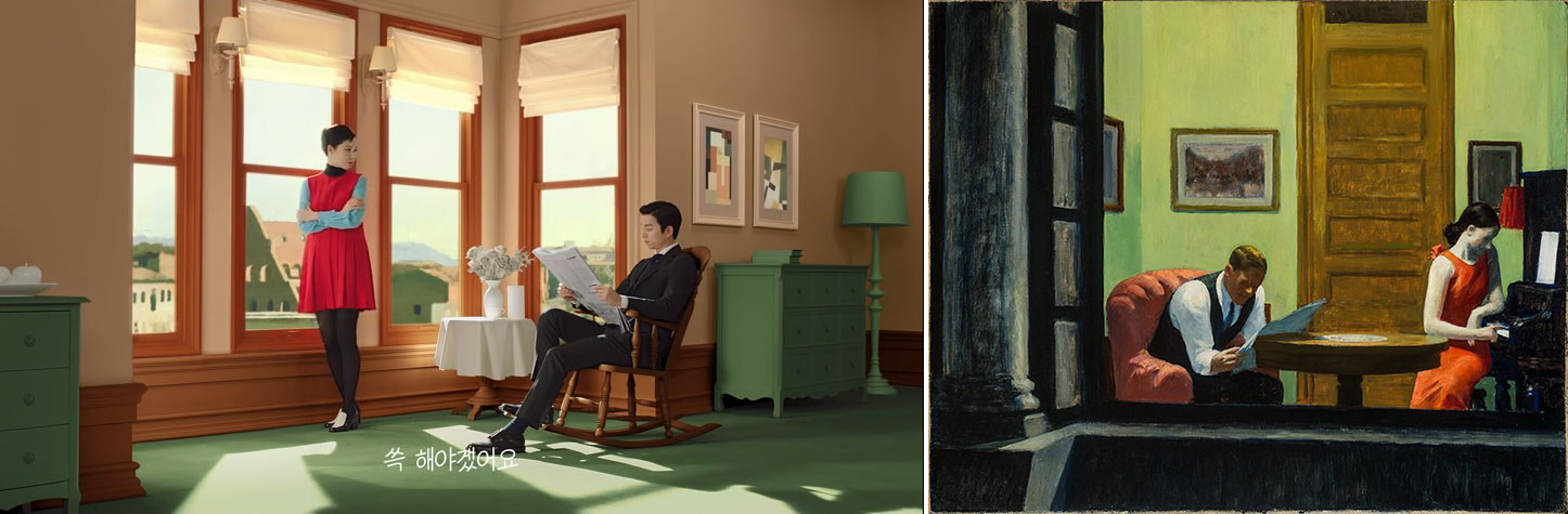 SSG 쓱 의 광고가 에드워드 호퍼의 작품을 오마쥬 했다고 하네요. 미국의 영화감독 히치콕도 에드워드 호퍼의 작품에 영향을 많이 받았다고 합니다. 영화 셜리의 모든것에서는 에드워드 호퍼의 그림 13점이 작품 속에서 활용되었다고 하네요.