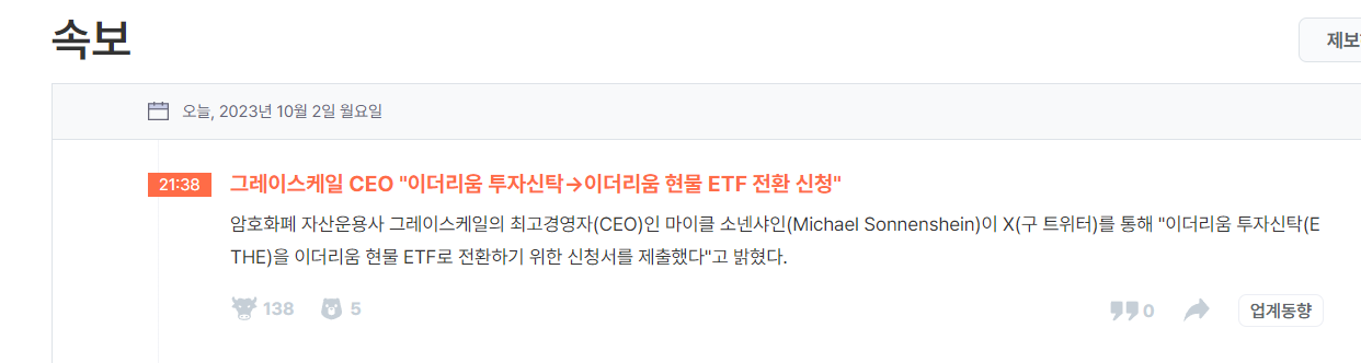 암호화폐 자산운용사 그레이스케일의 최고경영자(CEO)인 마이클 소넨샤인(Michael Sonnenshein)이 X(구 트위터)를 통해 "이더리움 투자신탁(ETHE)을 이더리움 현물 ETF로 전환하기 위한 신청서를 제출했
