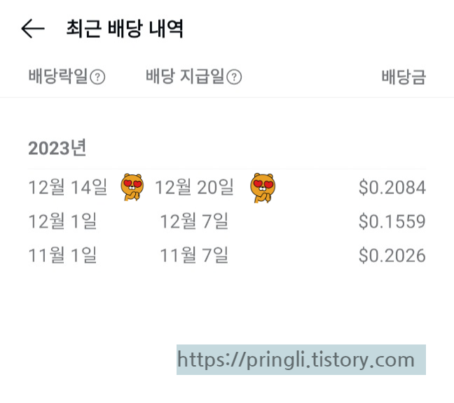 23년 12월 20일 3.9 달러 더 들어왔네요. 한주씩 돈 생길때 마다 매수해가겠습니다.